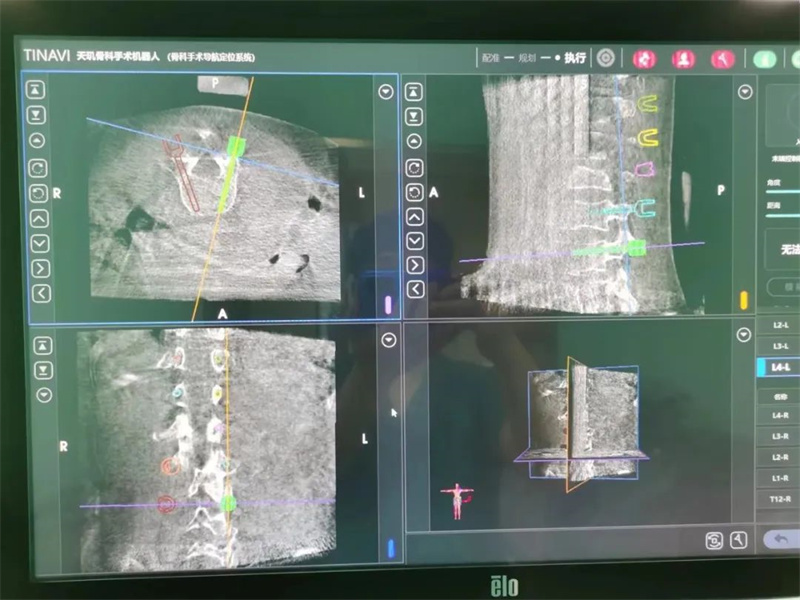 术中,骨科手术机器人准确遵循术前规划,根据配准结果,实时定位,短短20分钟内就完成了于骨折及相邻椎体处经皮人工置入10枚导针,建立钉道路径。术中透视显示,导针位置与手术方案的位置、角度完全贴合。随后,戴贺主任根据钉道路径依次精准置入螺钉,完成微创精准固定,手术顺利完成。