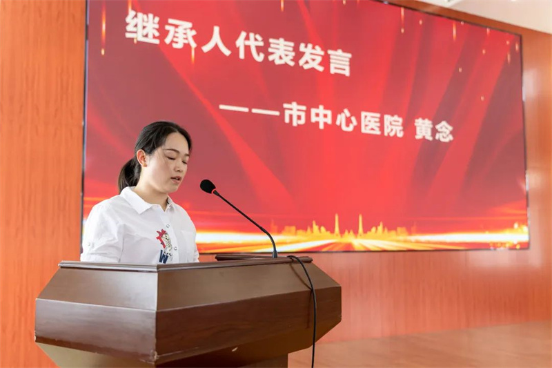 市中医医院针灸科主任杨贤海代表指导老师发言。杨贤海现场分享了中医师承工作中的经验,以及未来指导学习的规划。市中心医院黄念代表继承人发言,表达了对中医药工作的浓厚热爱、对中医师承的渴求,以及坚守医者初心、护佑人民健康的坚定信念。