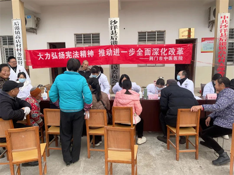 制作宪法相关资料数百份,随机宣传发放;并于12月7日组织临床第十二党支部进入沙洋县后港镇进行宪法宣传与义诊活动。16人名医务人员参加活动,开展了免费测血糖血压、火龙罐、雷火灸、针灸、刮痧等多项中医适宜技术,惠及群众一百余人。