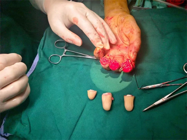"患者左手食指、中指和无名指末节完全断离。"谢长翔回忆道,"我们立即采取压迫止血、建立静脉通道、镇痛等急救措施,同时严格按照外科诊疗要求对离断指体进行处理,并快速完成术前检查,为再植手术争取宝贵的黄金救治时间。"